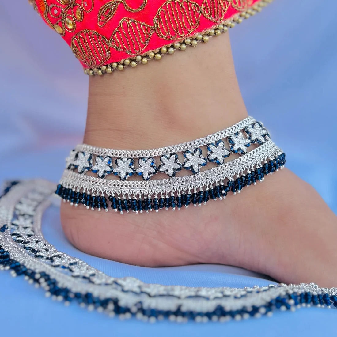 This silver-toned wide band anklet features an intricate floral design paired with delicate fringe detailing. Crafted to provide both style and comfort, its wide band ensures a secure fit around the ankle. The elegant flower motifs combined with the fringe offer a unique statement piece, ideal for enhancing traditional or contemporary outfits with subtle sophistication. Durable and lightweight, this anklet is perfect for everyday wear or special occasions.
